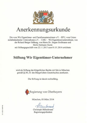 Die Grundlage der Stiftung Wir Eigentümer-Unternehmer ist es, die eigentümer- und familiengeführten Unternehmen in Deutschland und deren Wahrnehmung in der Öffentlichkeit ganz besonders zu fördern. Sie wurde in 2014 als rechtsfähige Stiftung des bürgerlichen Rechts mit Sitz in München gegründet, anerkannt von der Regierung von Oberbayern mittels Urkunde vom 5. März 2014.